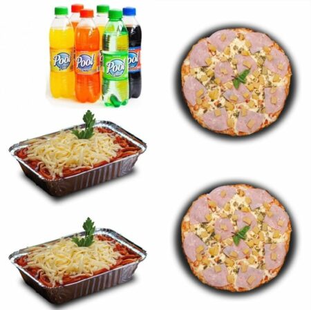 Pizza Aaron que contiene 6 agregos de la casa según disponibilidad, más un líquido (Malta Guajira).