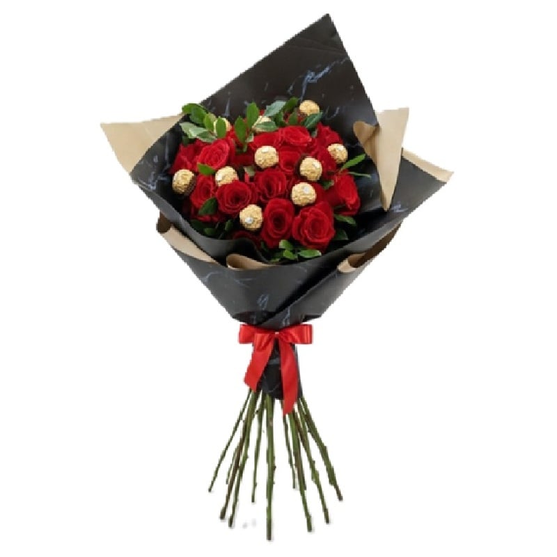 La combinación definitiva de elegancia y dulzura. Este ramo premium une la belleza clásica de 25 rosas frescas con el lujo irresistible de 10 bombones Ferrero Rocher, creando un regalo espectacular que impacta a la vista y deleita el paladar.