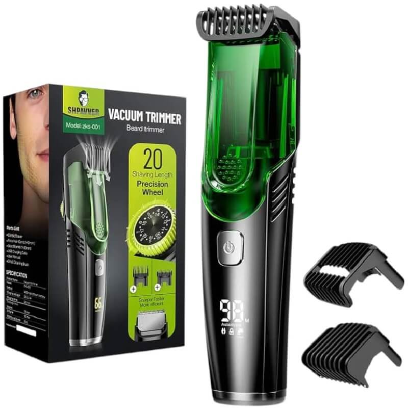 -Diseño de aspiración, limpieza sin esfuerzo: experimente una rutina de aseo sin problemas con nuestro recortador de barba al vacío para hombres. Nuestro recortador de vacío integrado de súper succión captura sin esfuerzo el cabello recortado en un compartimento interno para una fácil eliminación y limpieza. Di adiós a la barba dispersa en tu suelo, captura hasta el 90% de la barba cortada.