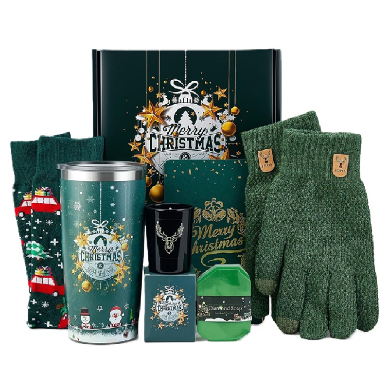 La exclusiva cesta de regalo de Navidad contiene 1 vaso aislado de 20 onzas, 1 vela perfumada, 1 calcetines, 1 guante, 1 jabón, 1 tarjeta de felicitación de Navidad.
