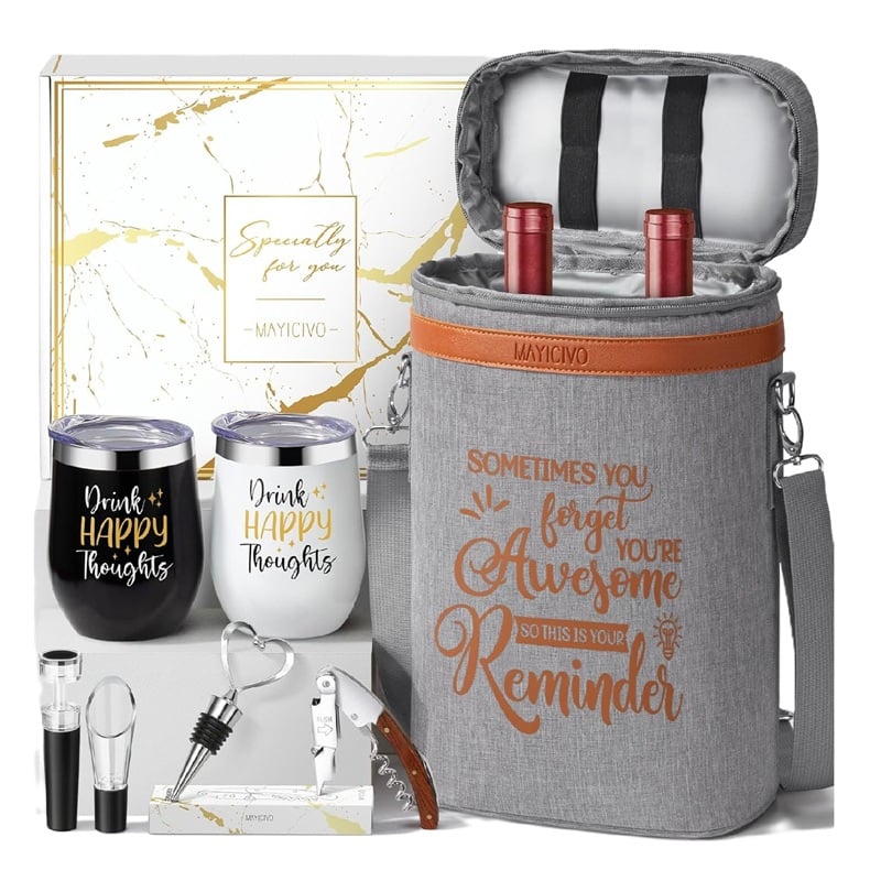 La amistad contiene todas las golosinas cuidadosamente diseñadas, incluyendo 2 vasos aislados de 12 onzas, bolsa de vino aislada, abridor de vino con sacacorchos 3 en 1, vertedor aireador de vino, tapón de vino en forma de corazón, tapón de vino al vacío, bolsa de almacenamiento con cordón y elegante caja de regalo.