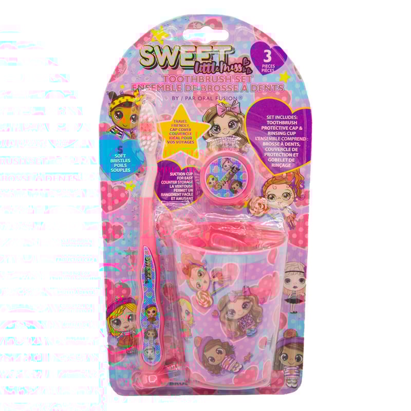 Cepillo de dientes, tapa protectora para el cepillo y vaso de enjuague