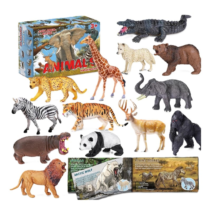 Paquete de 13 juguetes de animales salvajes con folleto educativo y caja de regalo, figuras realistas de animales de safari para niños, figuras de animales de zoológico de plástico para niños de 1 a 3