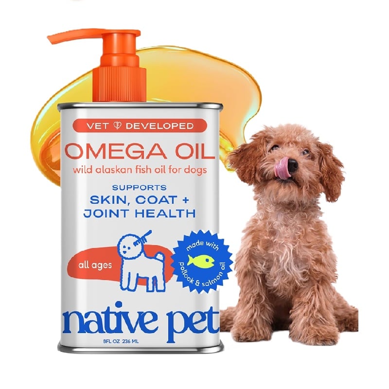 Native Pet – Suplemento de aceite de pescado para perros con Omega 3 EPA DHA, con bomba líquida fácil de servir, para la picazón y movilidad, aceite de abadejo y salmón.
