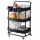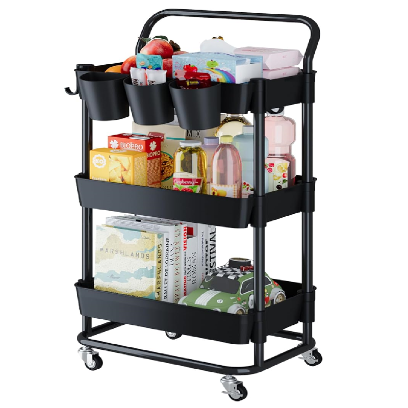 Carrito de utilidades de 3 niveles Buzowruil, carrito de almacenamiento con mango multiusos y ruedas bloqueables, con cesta colgante y gancho para oficina, cocina, baño, negro
