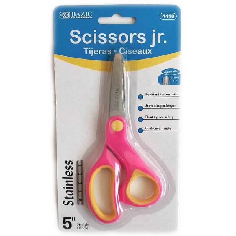 Tijera de acero inoxidable de mango recto de 5″ para niños a partir de 4 años, marca Bazic. Resistente a la corrosión y presenta punta redonda para mayor seguridad.