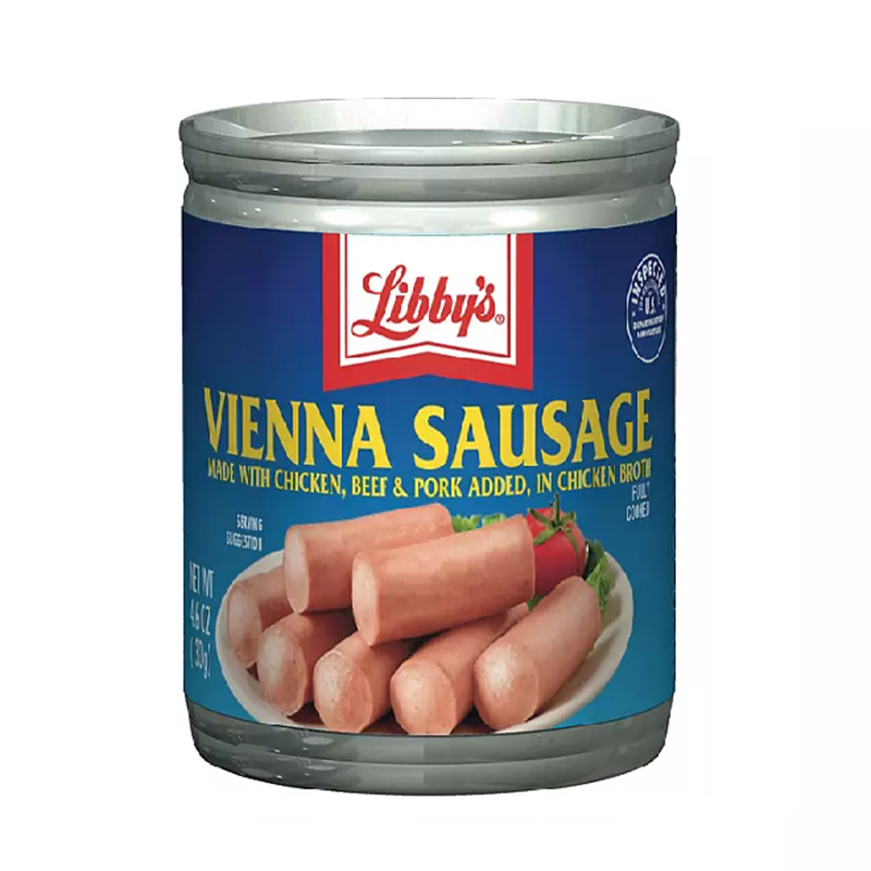 Salchichas de Viena de Libby’s® (latas de 4.6 oz, 18 unidades). Están completamente cocidas y listas para comer. Jugosas y sabrosas, estas delicadas salchichas sazonadas ofrecen un bocado de sutil sabor y textura en cada mordida.¿Qué hay en las salchichas de Viena de Libby’s? Las salchichas de Viena de Libby’s están hechas con pollo, cerdo y carne de res, cuidadosamente sazonadas y completamente cocidas en un delicioso caldo de pollo. Cada porción de cuatro enlaces contiene 190 calorías y cero azúcares, dándole suficiente energía para continuar hasta su próxima comida.Deliciosas en Diferentes Recetas Sabrosas directamente de la lata, las salchichas de Libby’s también son un delicioso ingrediente en una variedad de comidas. Úselas para añadir un toque de sabor a sus recetas favoritas. Píquelas como base para una sopa de salchichas de Viena o para dar un poco de sabor a un plato de macarrones con queso y salchichas. Agréguelas a las lentejas, mézclelas en huevos revueltos o impresione a sus amigos con burritos de salchichas de Viena. Ya sean frías, calientes o disfrutadas directamente de la lata, ellas son