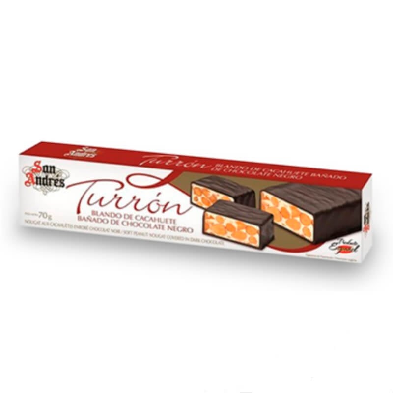 Turrón blando de cacahuete bañado de chocolate negro, marca San Andrés.